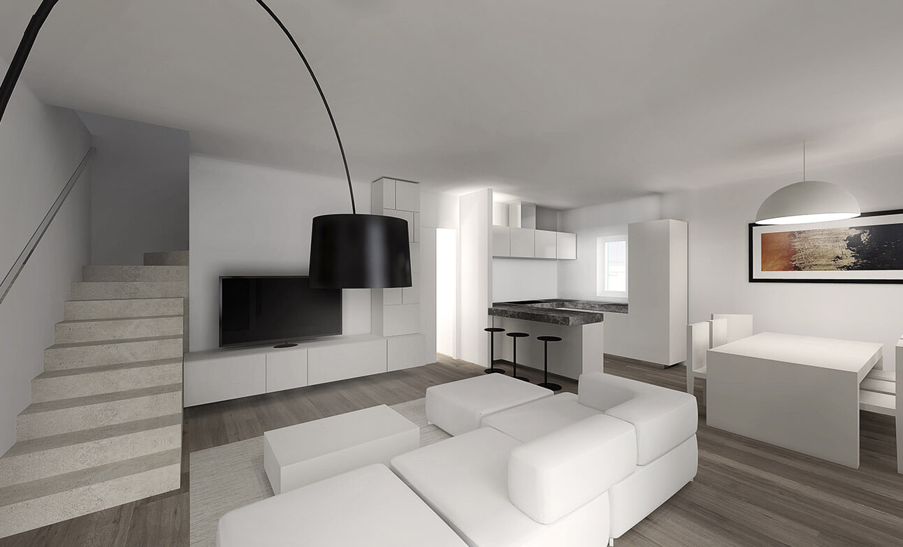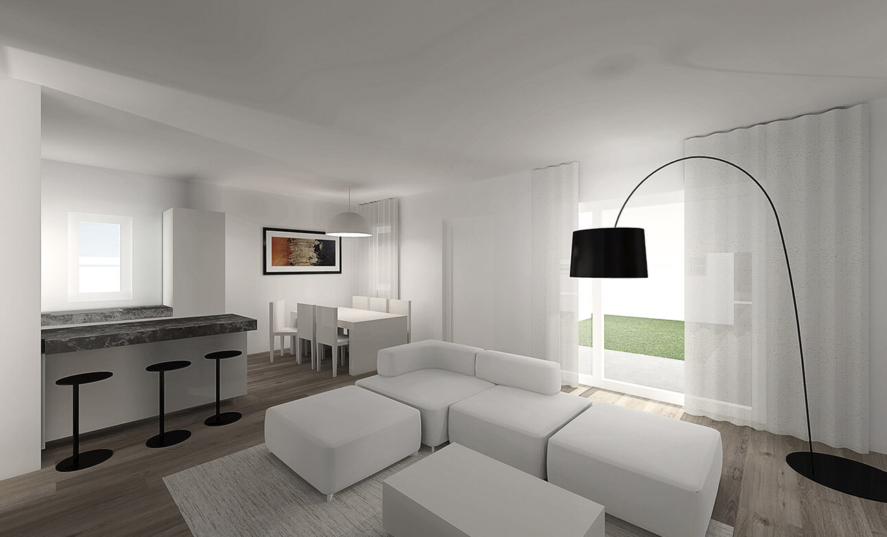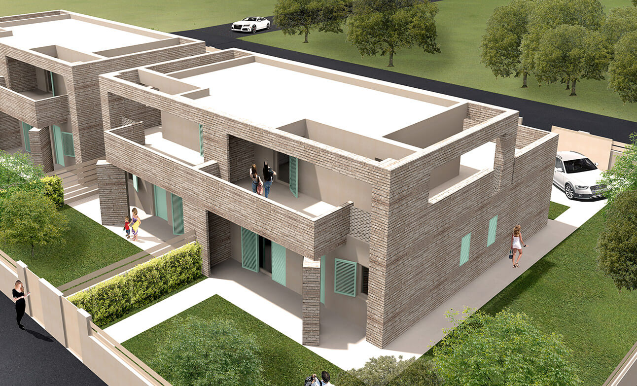 Studio di fattibilità di un edificio quadrifamiliare con mattoni faccia vista che ne caratterizzano i prospetti.